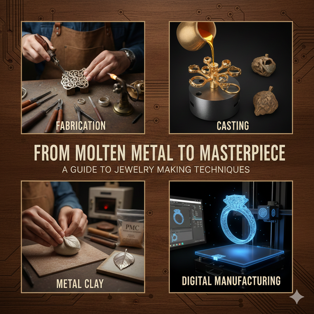 Jewelry making is a unique blend of chemistry, engineering, and art. Below, we explore the four primary pillars of jewelry creation: Fabrication, Casting, Metal Clay, and Modern Digital Manufacturing.