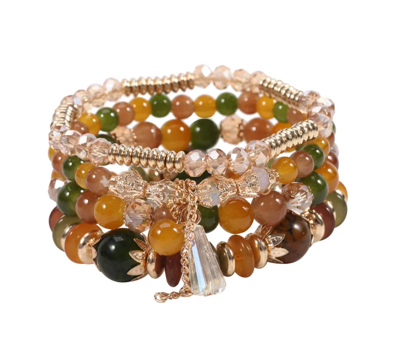 This collection features multiple strands of vibrant multi colors beads, meticulously crafted to exude sophistication and charm. Accented with gold-tone metallic elements and faceted crystal beads in subtle champagne hues, the bracelets offer a luxurious contrast.